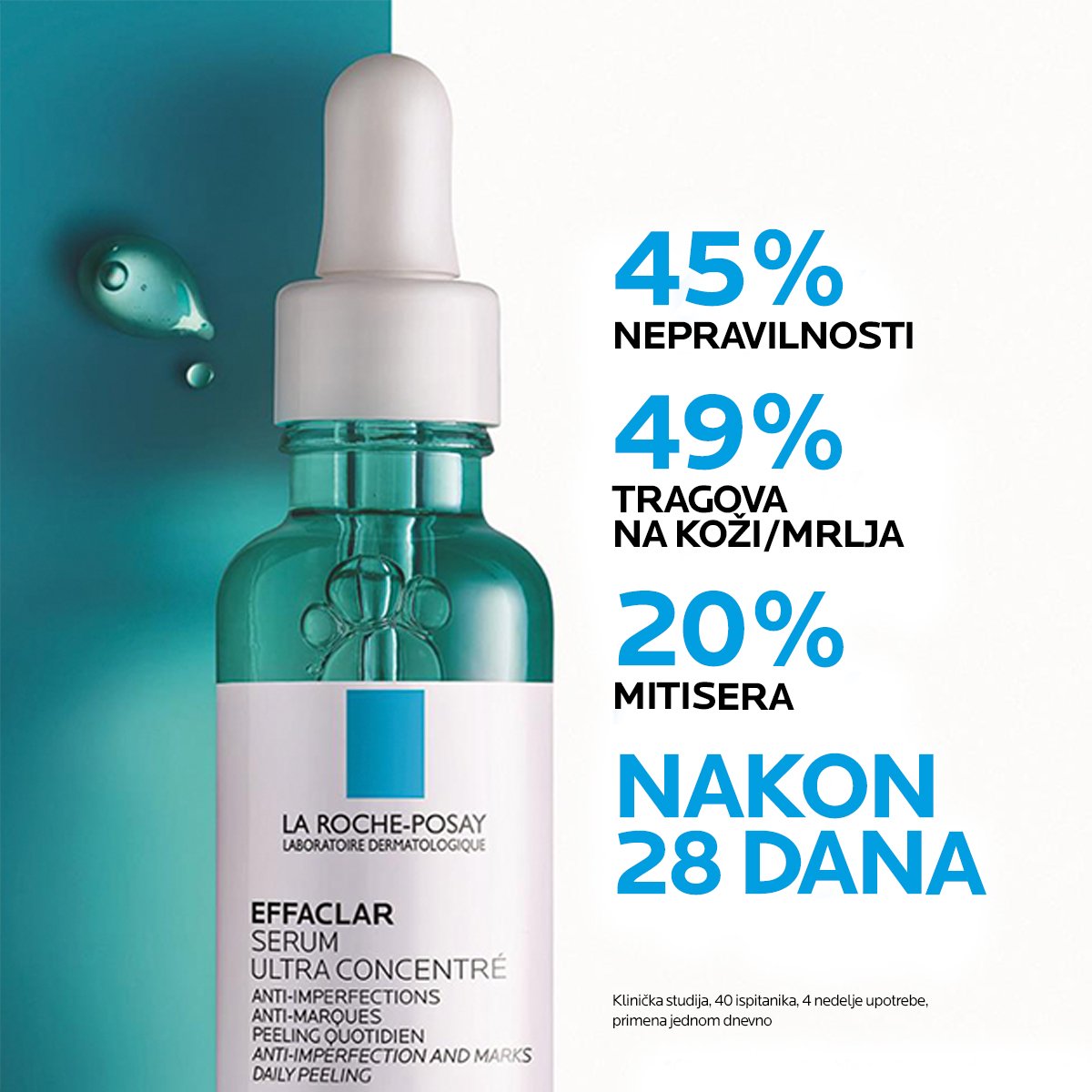Novi Effaclar serum sadrži visoku koncentraciju kiselina koje rade piling u kombinaciji s umirujućim niacinamidom, koji se bori protiv mitesera, prištića, mrlja na koži i vidljivih pora. Ova formula bez ispiranja ostavlja kožu čistom i pročišćenom.
