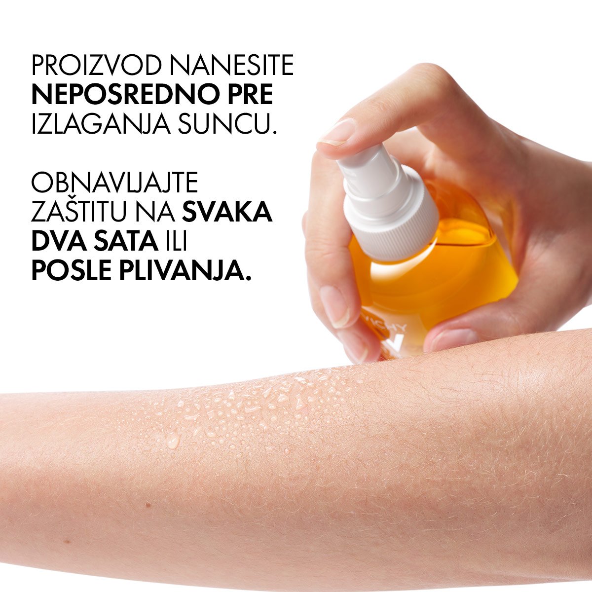 Primjena: Za optimalnu zaštitu prije izlaganja suncu snažno protresite, bogato nanesite i dobro razmažite kružnim pokretima po cijelom tijelu. Ponavljajte nanošenje često kako biste održali razinu zaštite, posebice nakon plivanja, znojenja ili brisanja. Ne raspršujte neposredno na lice, razmažite po dlanovima prije nanošenja. Izbjegavajte područje oko očiju. U slučaju kontakta s očima odmah ih temeljito isperite. Nedovoljna količina proizvoda i preslabo mućkanje prije upotrebe smanjuju razinu zaštite.