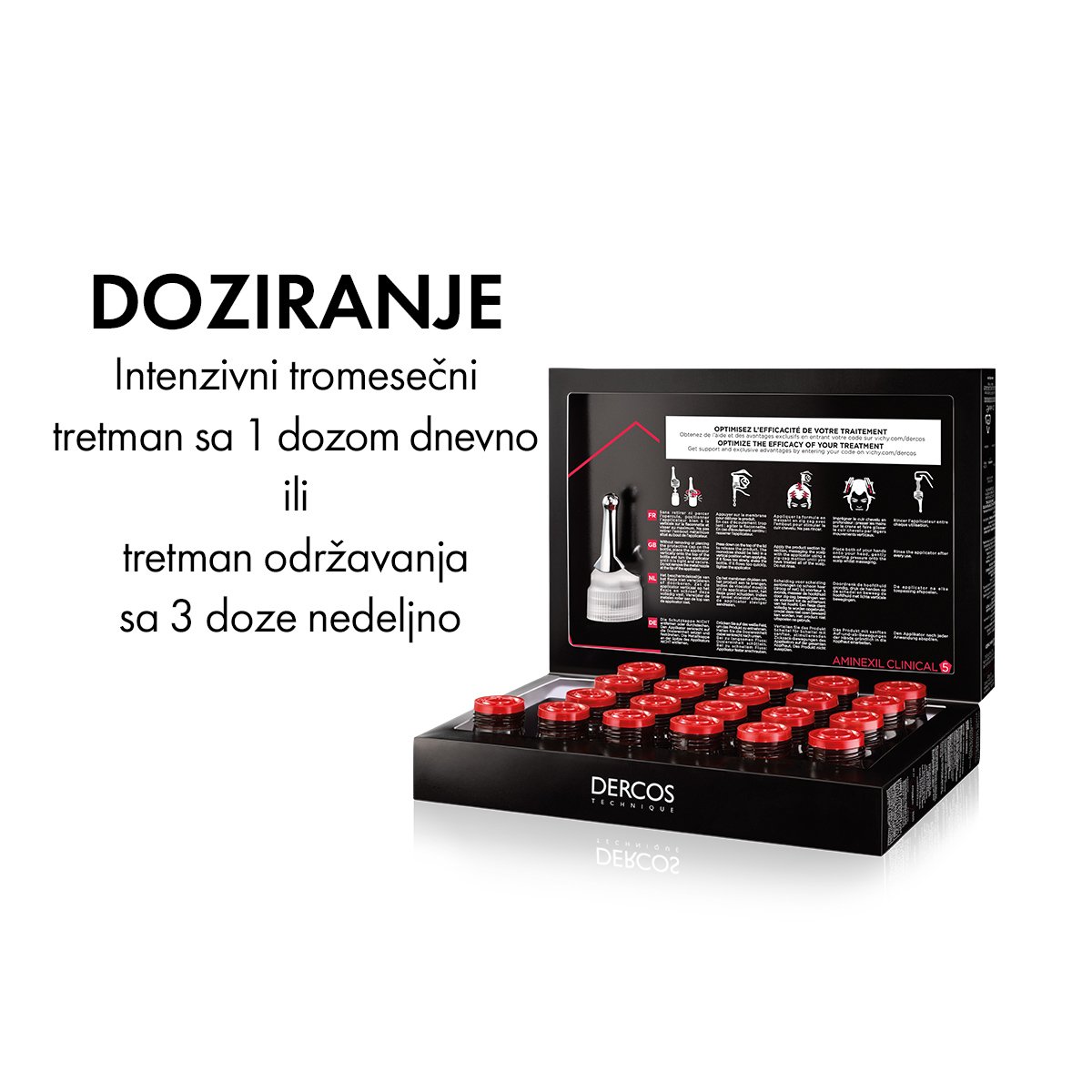 Unapređena formulacija amineksil ampula koristi se za sprečavanje opadanja kose kod muškaraca. Pojačava pričvršćenost dlake za vlasište. Hipoalergeno, pogodno i za osetljivo vlasište. Jedna ampula dnevno tokom šest nedjelja. Period održavanja tri ampule nedjeljno. Ampula može da se nanosi na suvu ili vlažnu kosu.