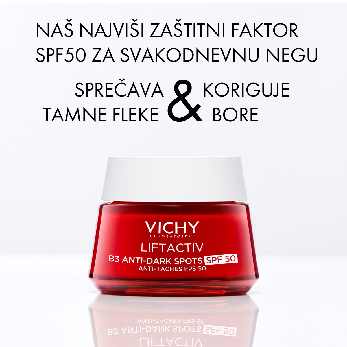 SPF50 ima veoma značajnu ulogu u zaštiti od UVA i UVB, dok u isto vrijeme djeluje protiv postojećih znakova fotostarenja (bore, tamne mrlje).