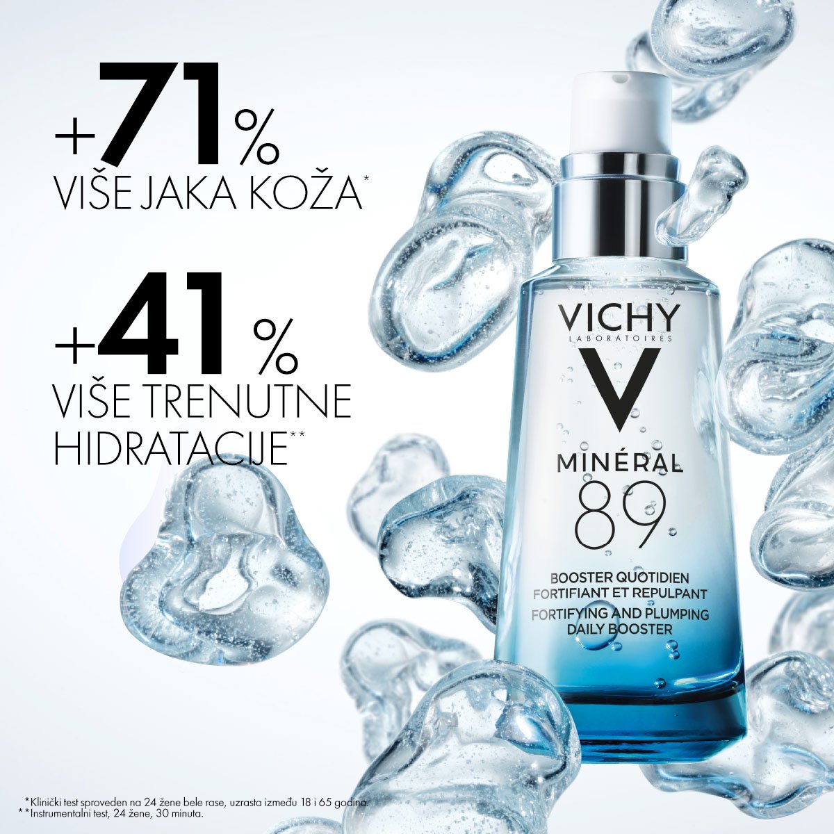Jedinstvena kombinacija Vichy mineralizirane termalne vode po prvi puta u koncentraciji od 89% udružena s hijaluronskom kiselinom prirodnog porijekla. Minéral 89 jača funkciju barijere kože koja je svakim danom sve jača u borbi protiv štetnih utjecaja zagađenja, stresa i umora.